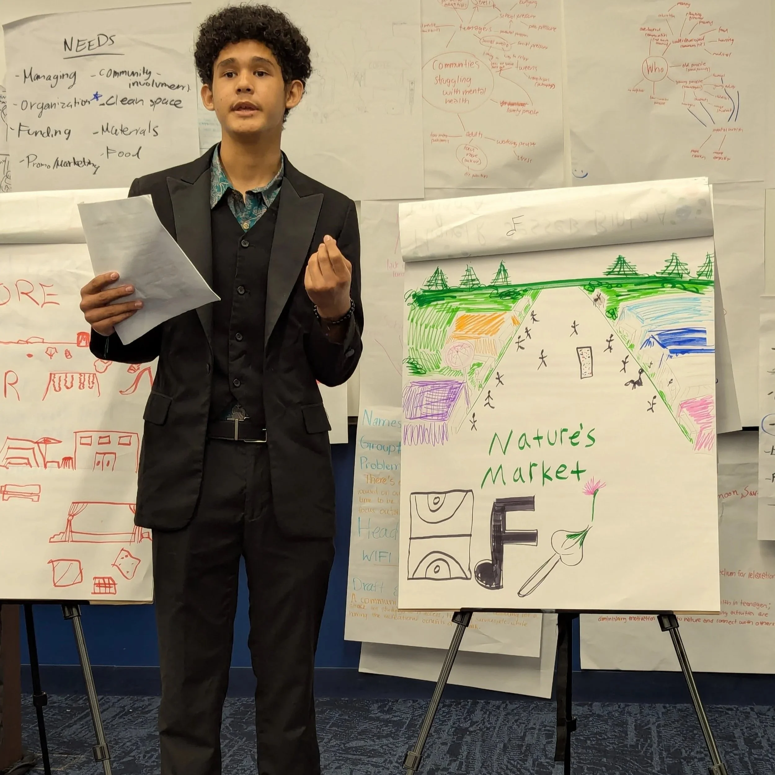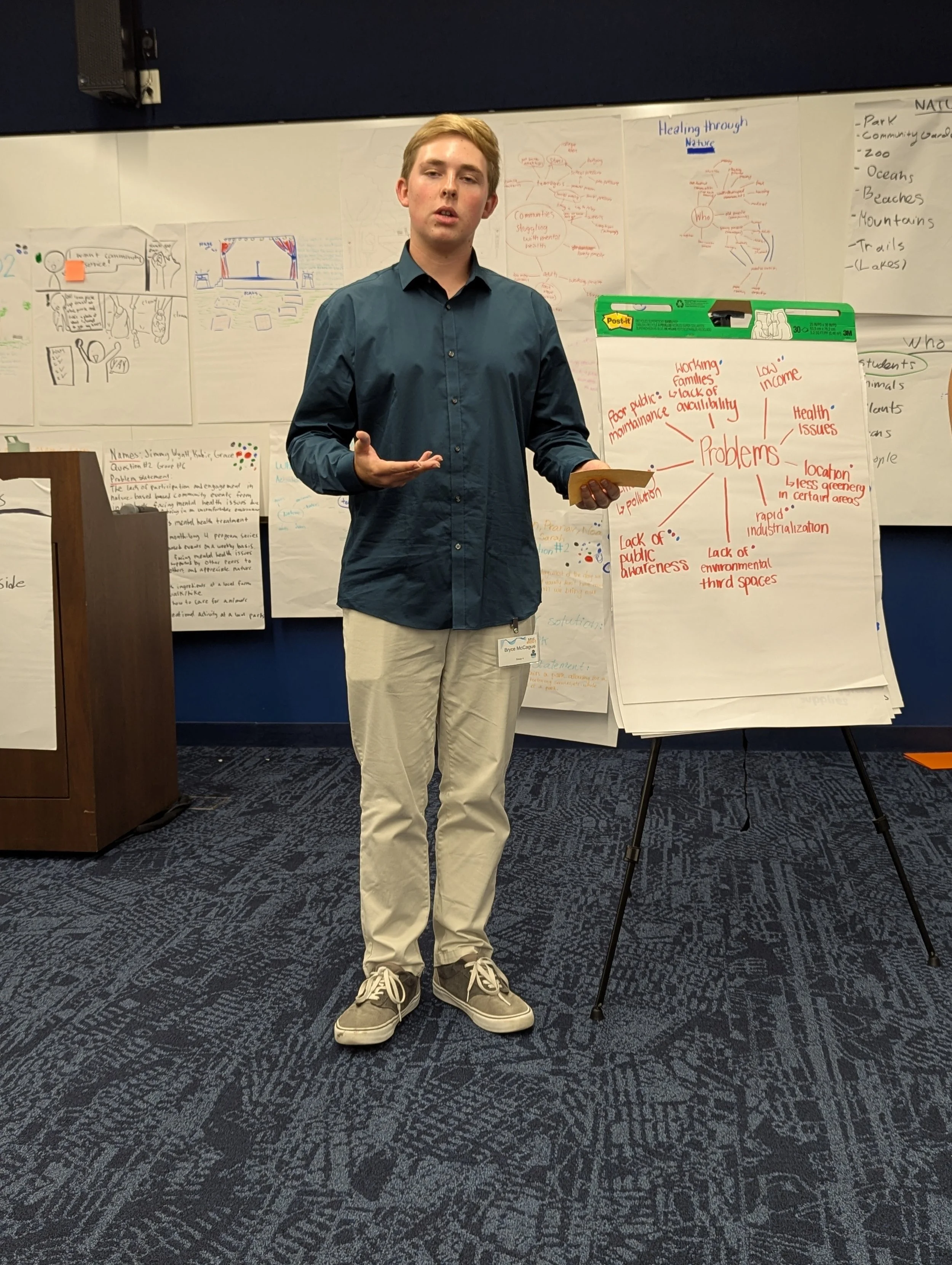 Students begin the symposium by exploring challenges related to youth access to nature in their communities. Through guided discussions and interactive activities, participants learn the foundations of design thinking while identifying barriers that prevent young people from connecting with the outdoors.