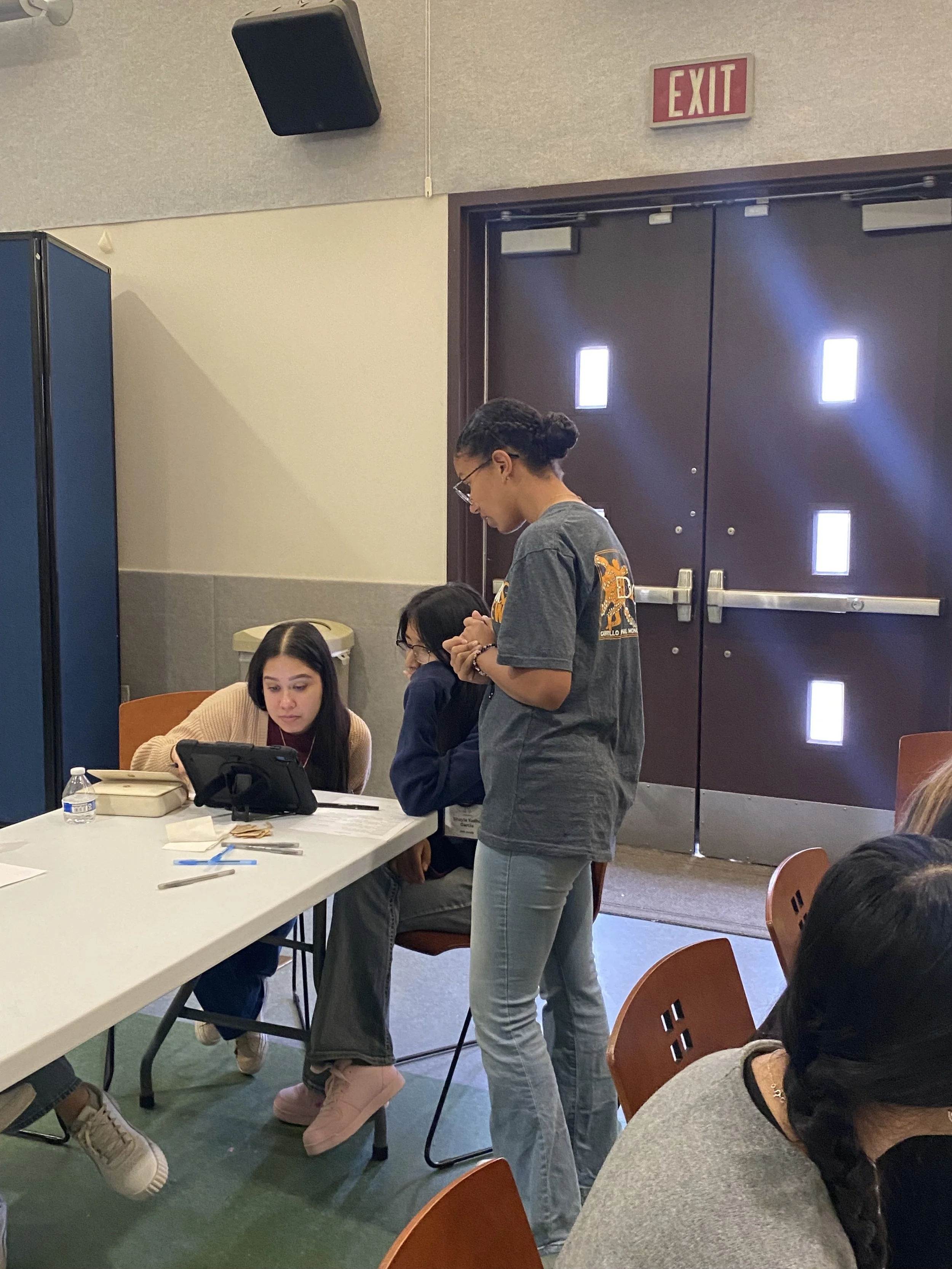 Youth apprentice Kirin G. is working alongside Mana De San Diego youths and their mentors. Kirin G. is helping participants navigate through iPads and answering questions.