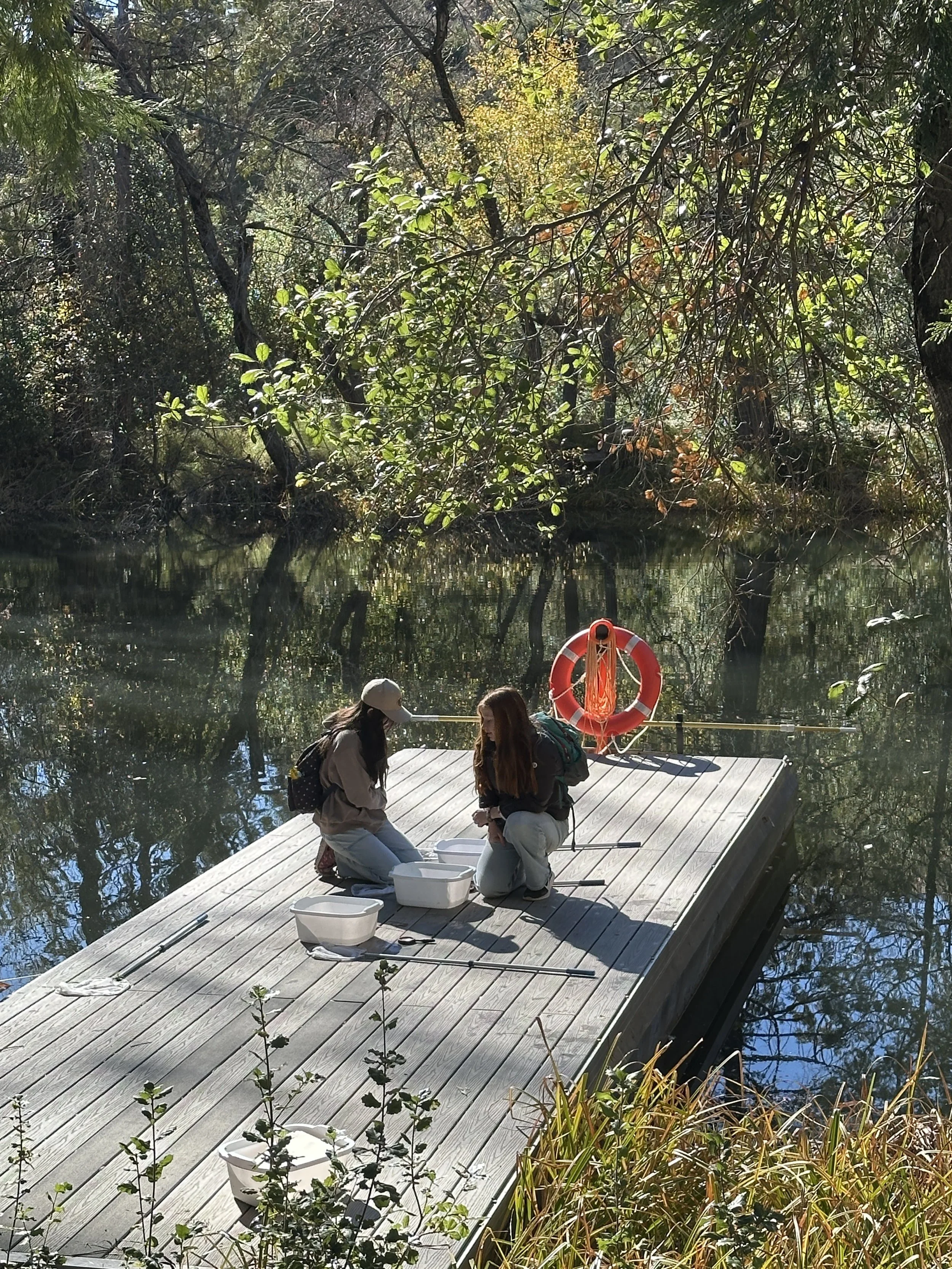 Apprentices Jocelyn C. and Kate W. sit side by side at the end of a wooden dock with a white container and long-handled nets. They observe and analyze a water sample they collected as part of their research project on water quality.