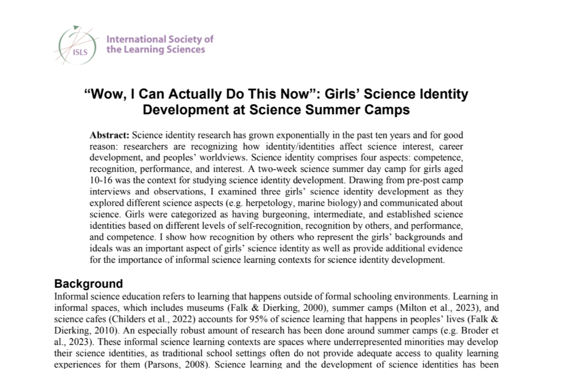 “Wow, I Can Actually Do This Now”: Girls’ Science Identity Development at Science Summer Camps (ISLS)